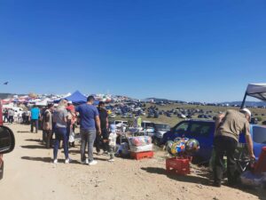 Foarte multe maşini care stau în cozi de kilometri pe drumuri prăfuite şi înguste. Cei curajoşi şi încăpăţânaţi rămân în coloana prăfuită şi se încumetă să meargă tot mai aproape de locul de unde se aude muzică şi se vede fumul de la grătarele de mici şi pastramă. Alții, își lasă mașinile greu încercate pe unde pot și urcă dealul pe jos.